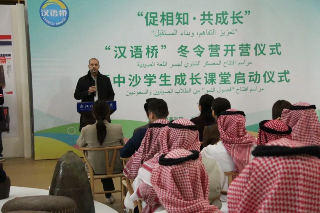 11月12日,“促相知·共成长”沙特学生“汉语桥”冬令营开营仪式暨中沙学生成长课堂启动仪式在图书馆四楼举行,校党委委员、副校长柴改英出席仪式并致辞。来自阿卜杜勒阿齐兹国王大学的“汉语桥”冬令营带队教师和全体营员、浙外国际处和555电影