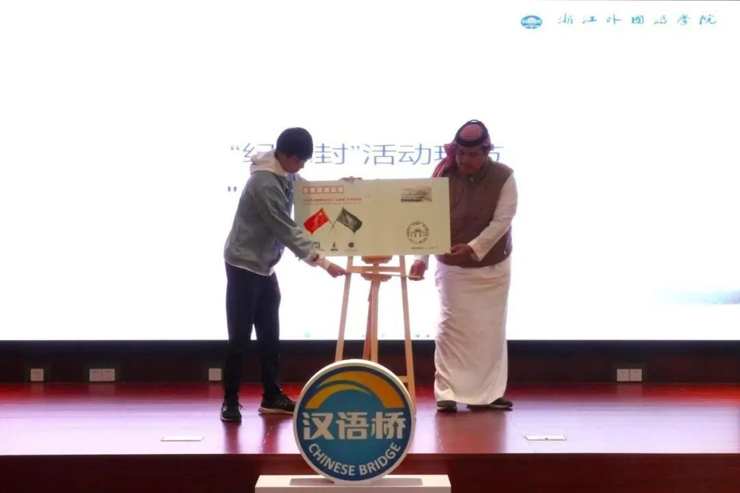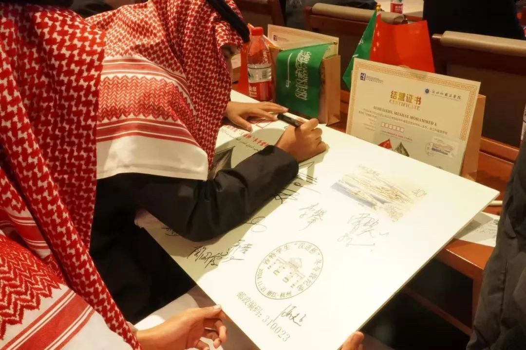在最后的“纪念封”活动环节,双方学生代表为沙特学生“汉语桥”冬令营纪念封揭幕,全体与会成员还在纪念封样式的明信片上签下自己的名字、写上祝福的话语。值得一提的是,所有明信片均已贴好邮票,并经由西湖区留下邮政支局盖上了“11.21,留下”日戳。