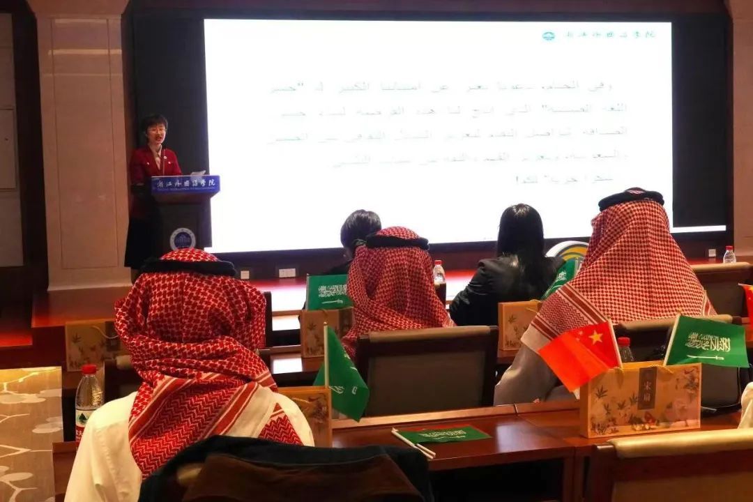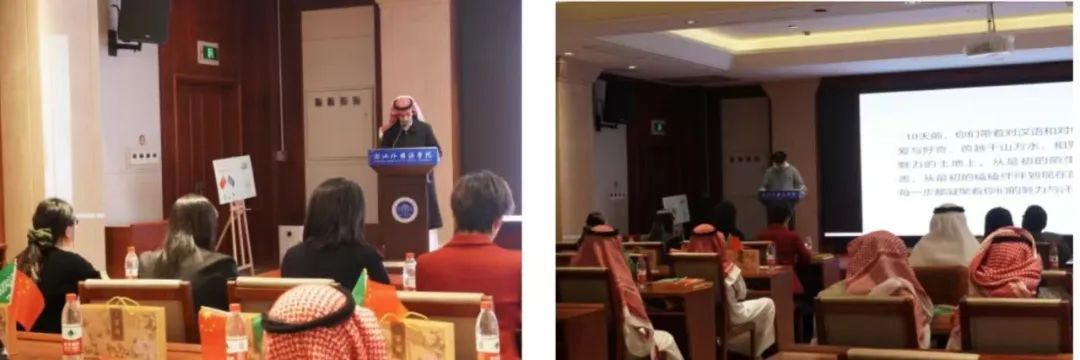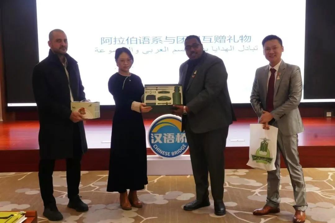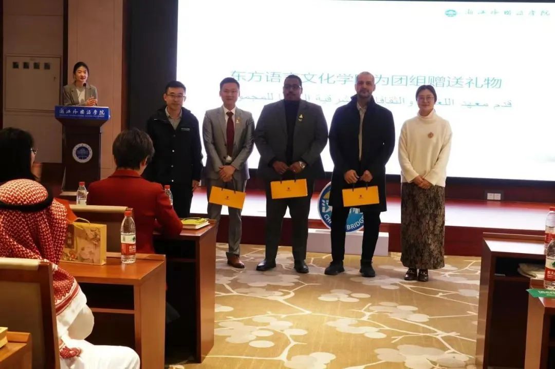 院长曹笑笑、党委副书记宋洋以及阿卜杜勒·阿齐兹国王大学现代语言文学系教师奥玛和图尔基博士代表双方互赠了礼物。阿拉伯语系主任郑蓉还代表阿语系向对方赠送了礼物。