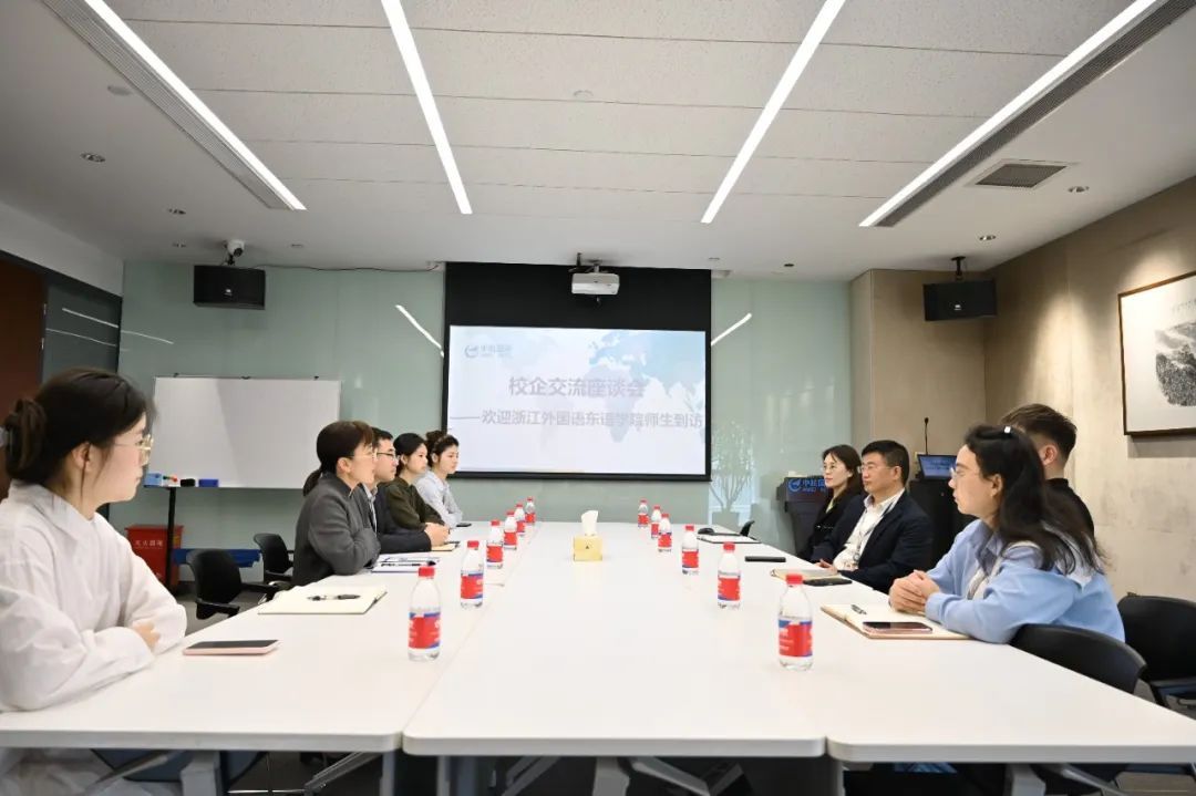 师生进行座谈。周连兵就企业发展历程、目前企业外语类专业人才需求和岗位招聘要求、公司海外项目开展情况、企业员工的发展与晋升等作了详细介绍,表达了希望与555电影