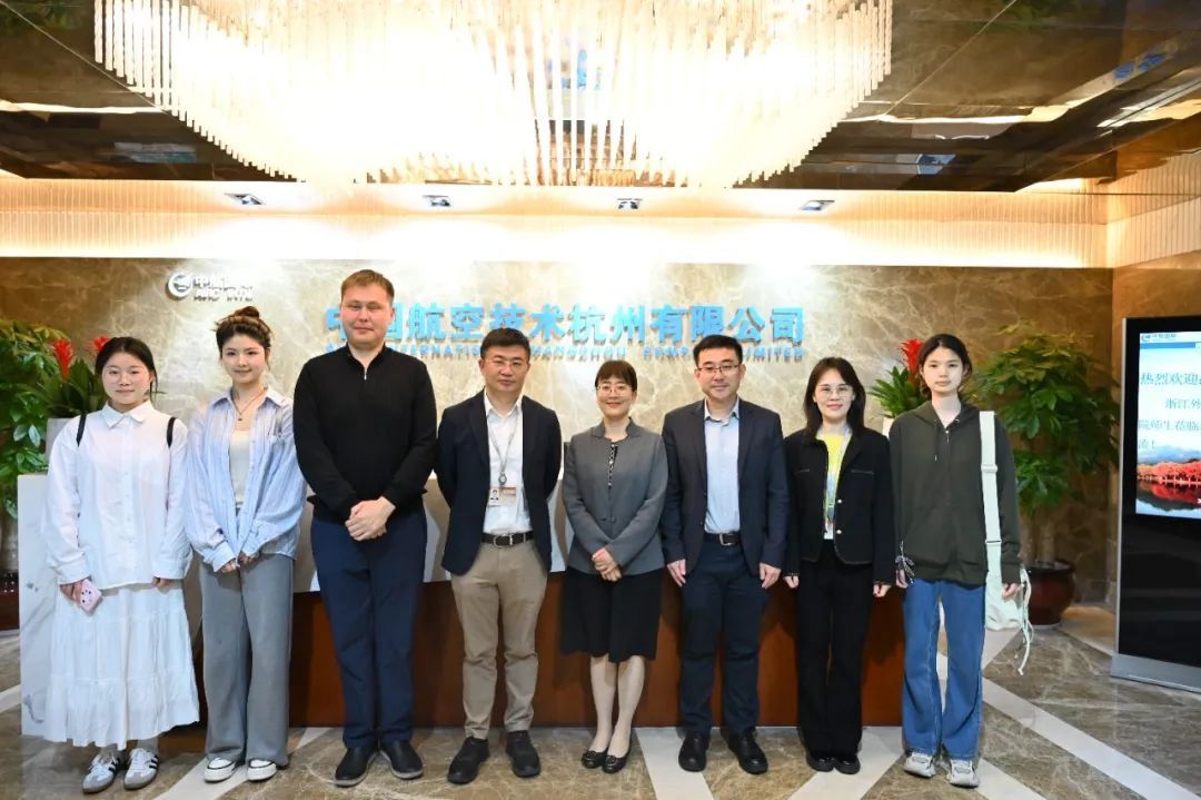 党委书记夏颐、党委副书记宋洋,毕业班辅导员蔡胜以及2025届阿语专业毕业生代表等一行赴中国航空技术杭州有限公司参观交流。