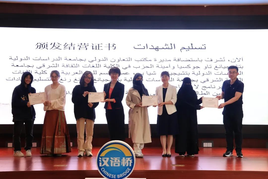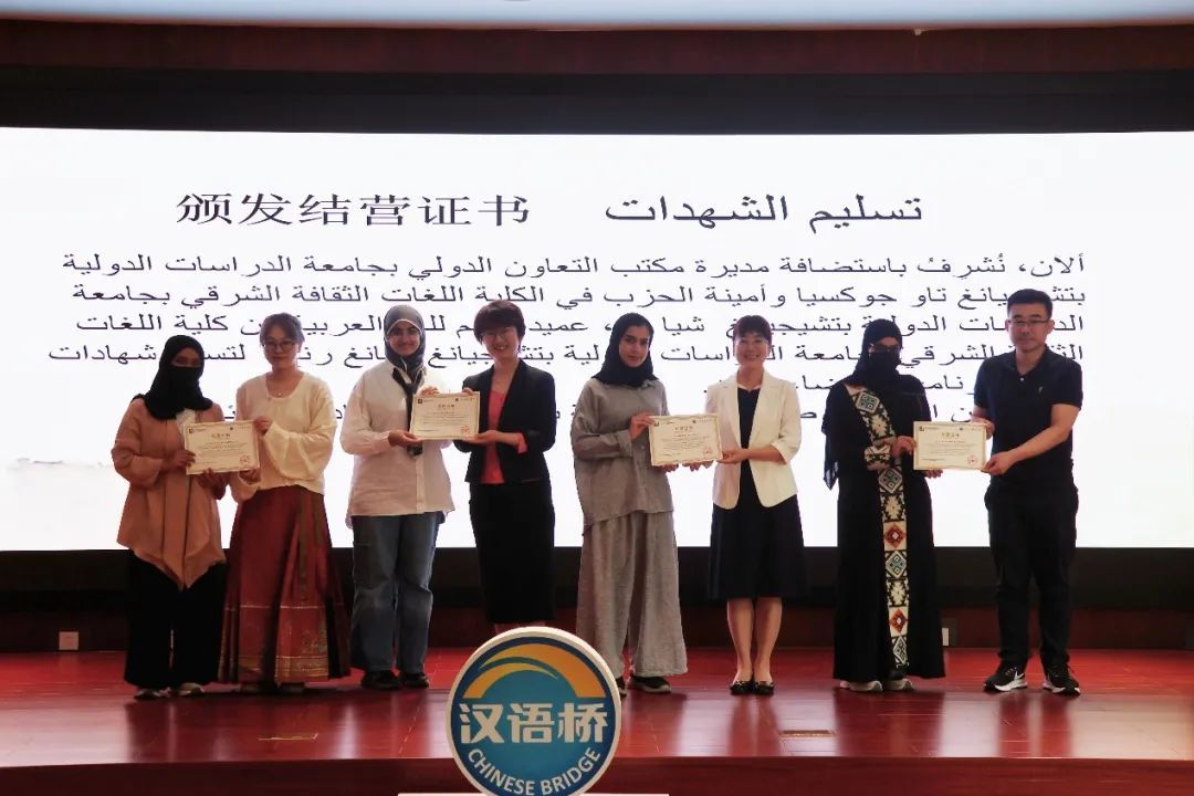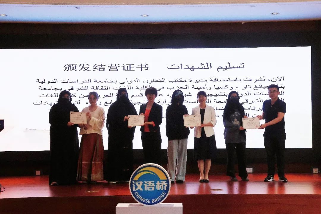 党委副书记宋洋以及阿语系系主任郑蓉,为沙特学生颁发“结营证书”,沙特学生依次上台领取。