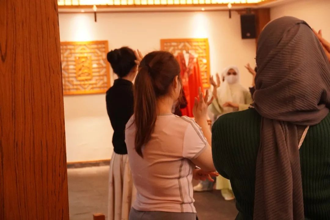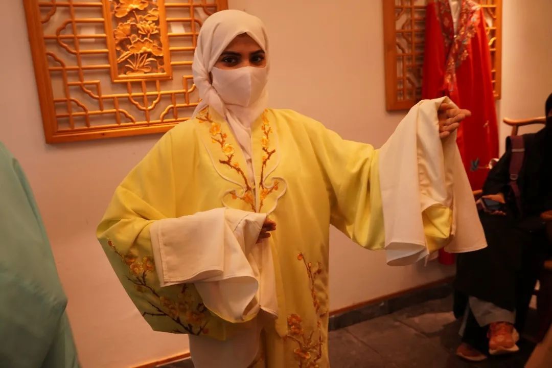 在学习完唱腔后,营员们纷纷换上传统戏衣,学习甩袖身段。营员杜若在尝试甩袖动作时笑道:“这比跳舞难多了!但穿上戏服真的很美。”大一的学生若琳(REEM FAISAL)也连声赞叹:“中国传统戏剧服装太震撼了,我很喜欢。”