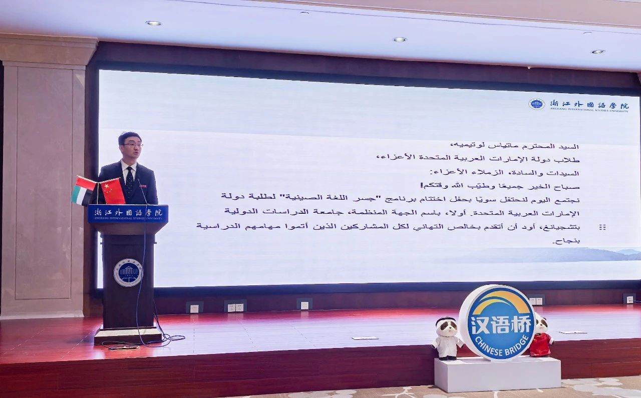 随团助理、2021级阿语专业学生纪洋在发言中分享道:“这段旅程中,我们一同领略了西湖的潋滟波光,感受良渚文化的深厚底蕴,在动物园里留下欢声笑语,于博物馆中开启求知探索。‘汉语桥’不只是一个语言学习的平台,它还提升了大家跨文化沟通的能力,更重要的是,它在不同文化间构筑起一座引发强烈共鸣的桥梁。能结识这样一群优秀的迪拜学子,对我而言是无比珍贵的收获,我满心期待着未来能与他们再次相逢。”