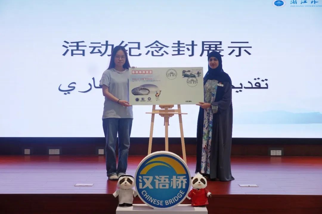阿语专业学生代表朱孙琳与营员代表萨拉(Sara)共同上台展示纪念封。全体与会人员还在纪念封样式的主题明信片上相互间写下寄语,纪念因此次“汉语桥”春令营而结下的情谊。