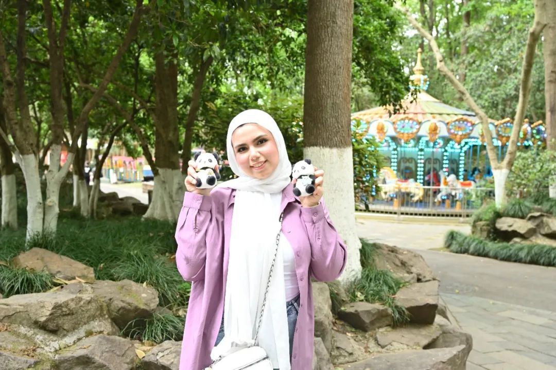 17日下午营员们走进杭州动物园,开启了一场自然与人文交融的探索之旅。期间,憨态可掬的大熊猫“春生”和“香果”让他们尤其兴奋。营员们簇拥在玻璃幕墙前,举着手机连拍不停。埃尔哈姆(Elham)直呼“比照片里更可爱!”一旁的希巴(Hiba)则被“春生”啃竹子的萌样吸引,一边录像一边感叹:“原来中国保护濒危物种的技术如此先进,这些‘黑白团子’太治愈了。”在离园前,营员们纷纷购买熊猫制品留作纪念。