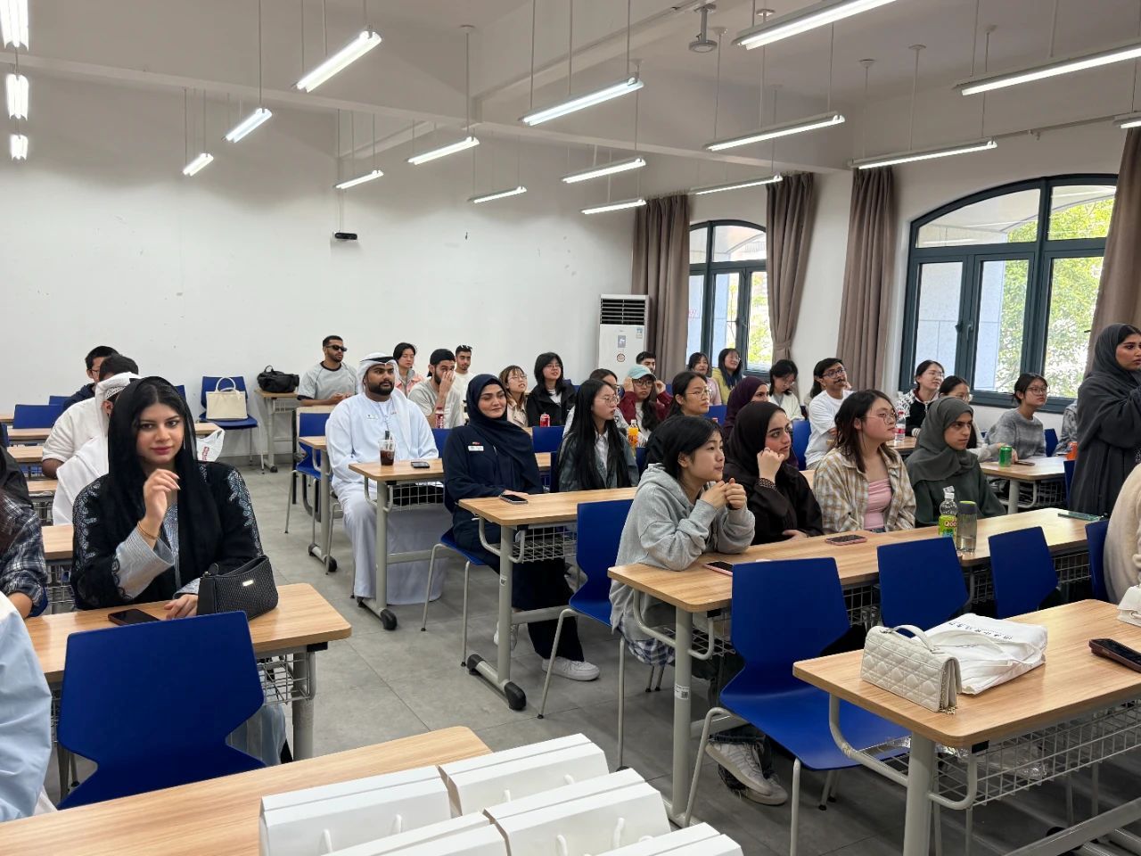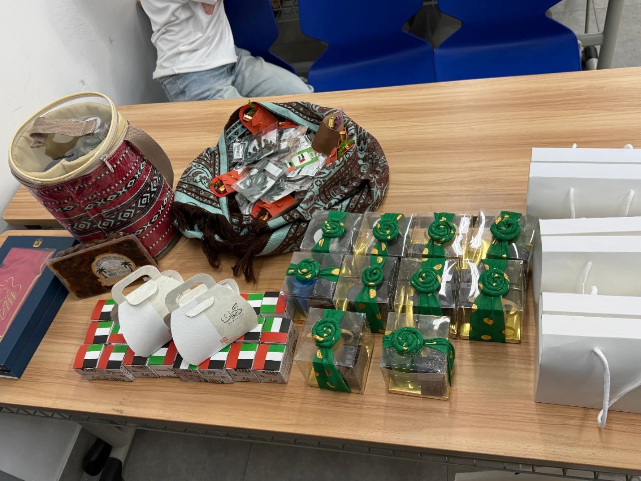 阿联酋的学生们特别热情,带来好多有他们当地特色的礼物,亲手把礼物送给中国小伙伴。这些礼物就像一个特别的纪念,让大家记住这段美好的时光。大家还一起鼓掌、互动,气氛特别好。就好像来自波斯湾的海浪,碰上了长江边的晨雾,相互交融。在“一带一路”倡议下,中国和阿联酋的年轻人通过这样的交流,共同进步,开启了友好交往的新篇章。