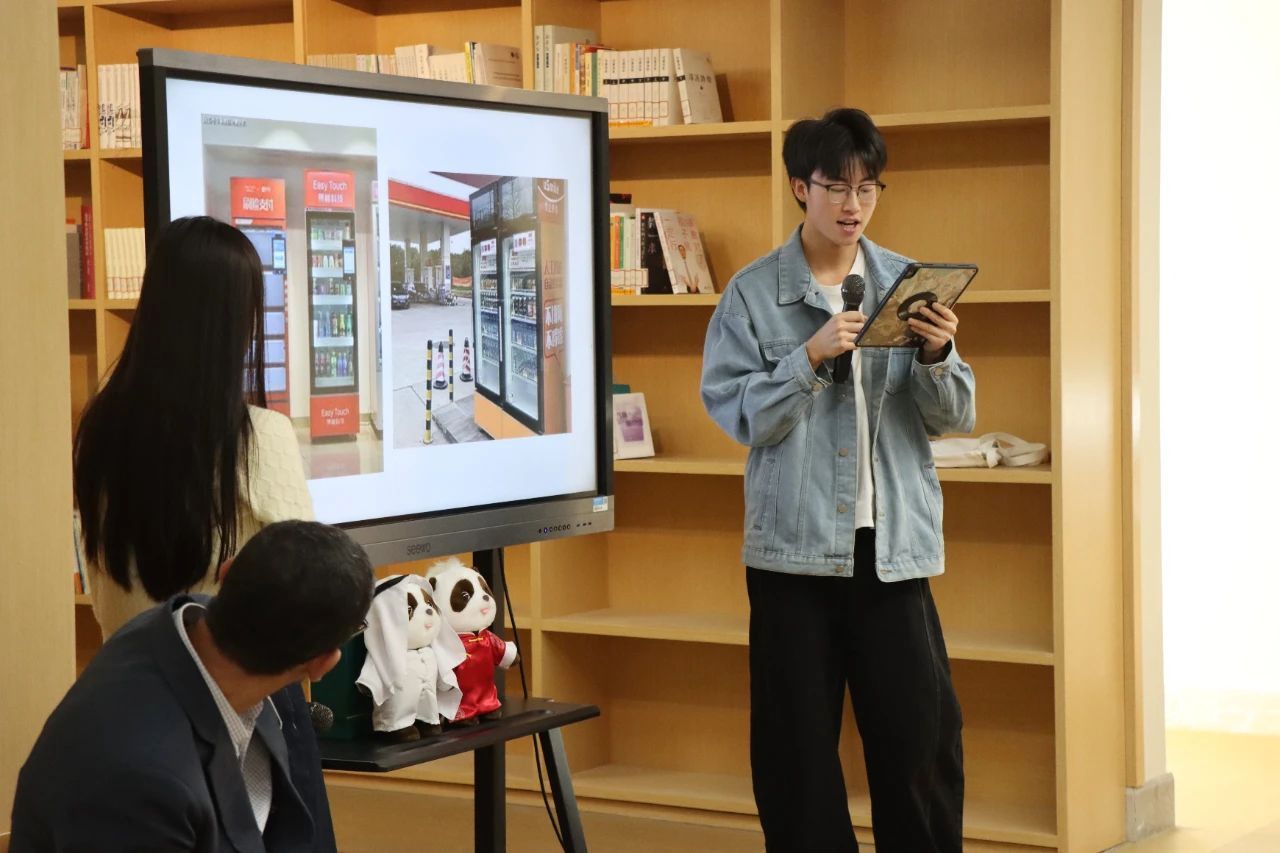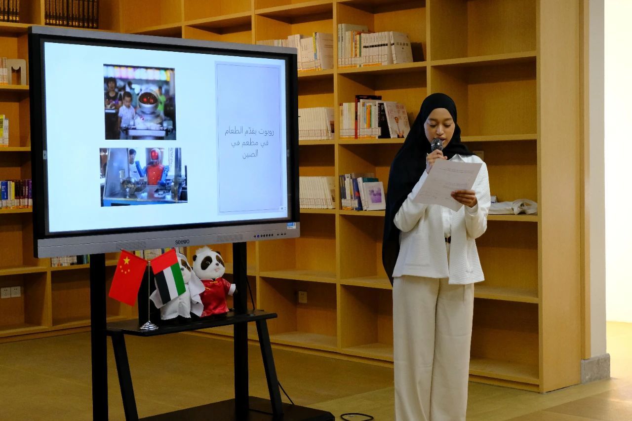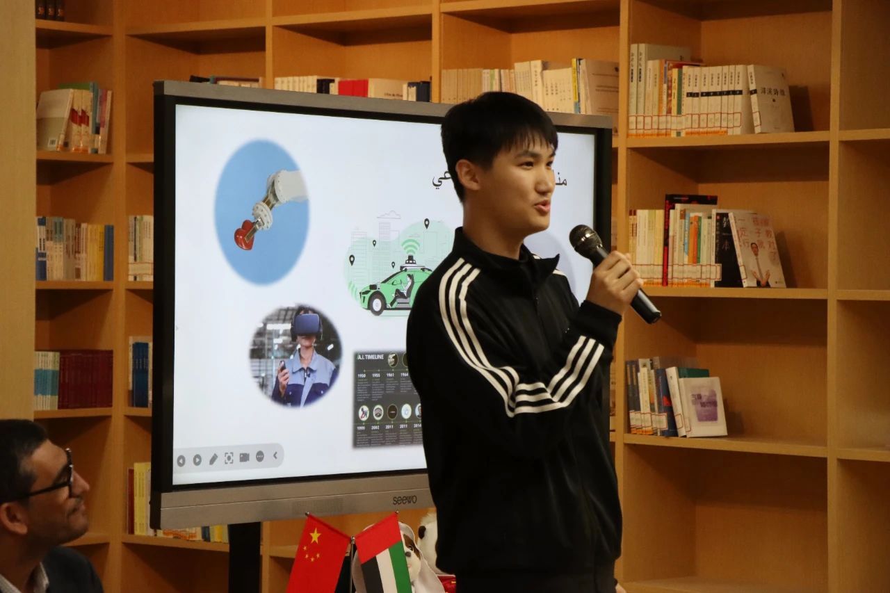 22阿语1班三名学生围绕主题作分享。林伦羽聚焦AI领域,深入探讨了其在同声传译、智慧医疗等前沿行业的卓越赋能表现。他指出,AI技术的飞速发展极大提高了这些领域的效率与准确性。但林伦羽也强调,技术并非万能。王皓则从日常生活的智能应用出发,通过扫码支付、智能家居等生动实例,为阿联酋同学们勾勒出一幅中国智能生活的便捷图景。章念子以独特的文化视角,围绕春节、文创产品、汉服等极具代表性的中国元素,深入浅出地诠释了中华传统文化如何巧妙融入当代生活。她提出“文化是正在发生的日常”这一观点,引发了在场中阿青年的强烈共鸣。