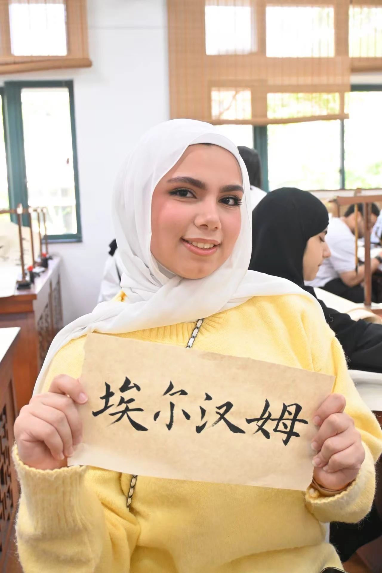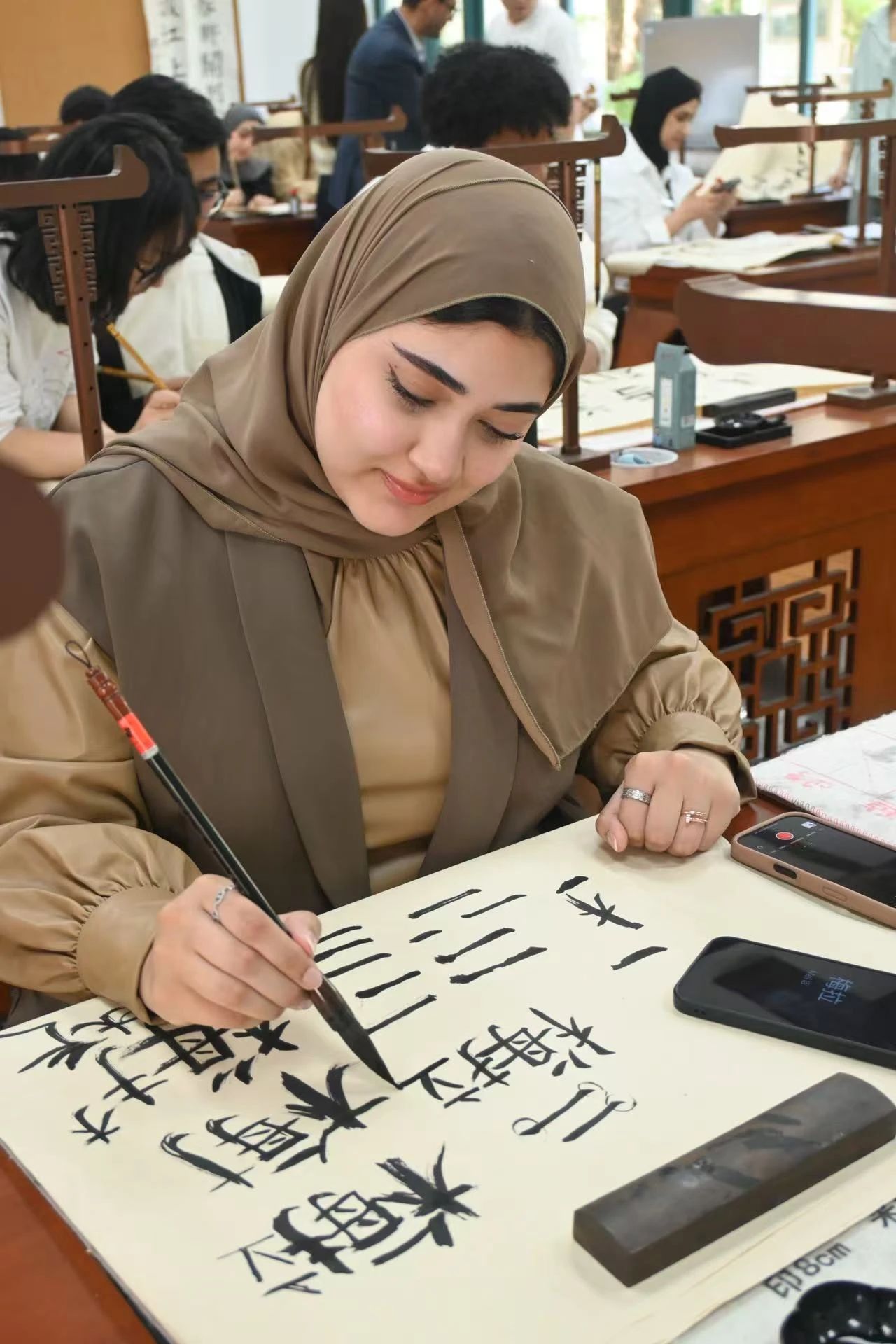 学子与阿联酋学生在毛笔与宣纸之间,体验了一场跨越时空的汉字之旅。活动现场,阿联酋学生们第一次拿起毛笔,在老师指导下认真书写自己的中文名字。字迹或稚嫩、或刚劲,却都饱含着新奇与喜悦。