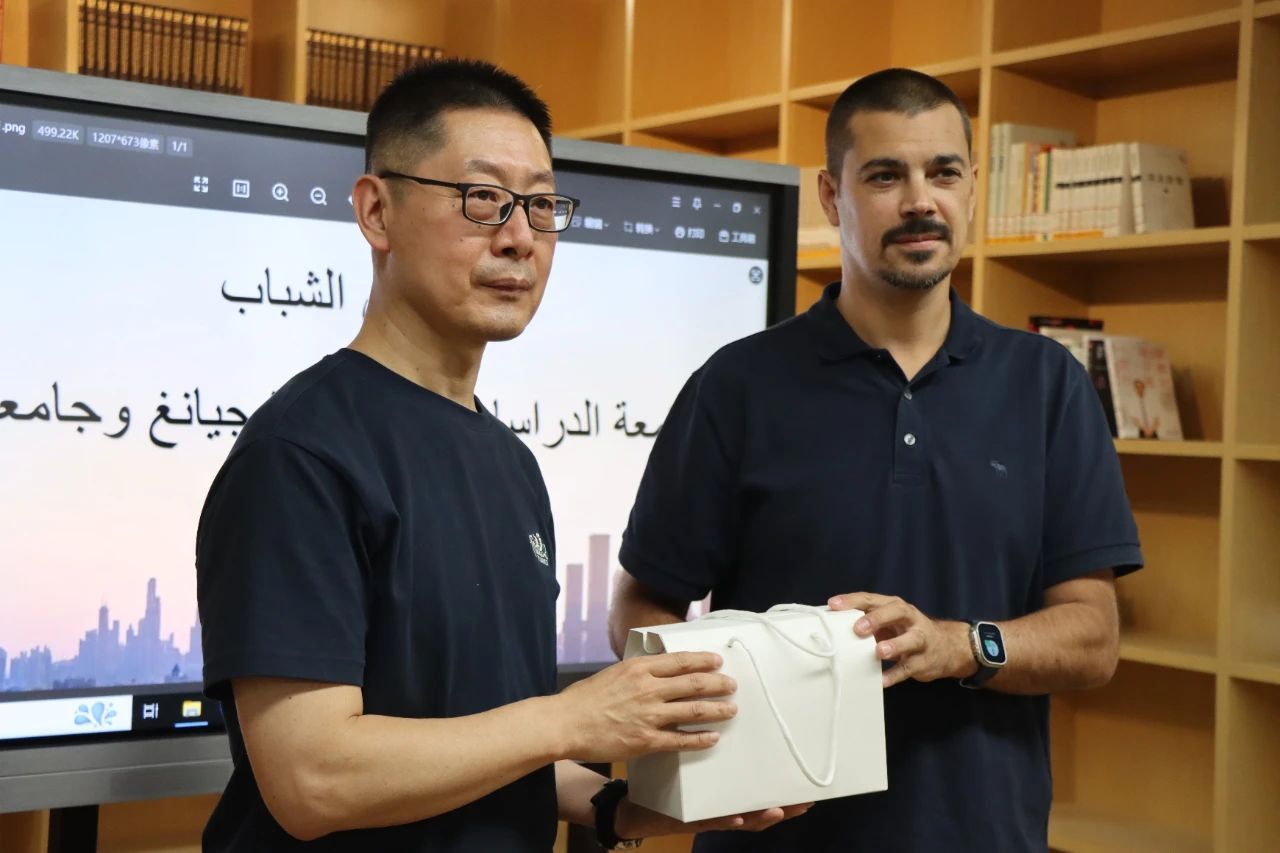 主题沙龙活动接近尾声时,中阿学生代表们围坐在一起,围绕人工智能的未来发展各抒己见,畅谈对其应用场景、发展趋势的设想与期待。大家积极分享观点,现场讨论气氛热烈而融洽,思维的火花不断碰撞。阿联酋团组带队教师还向刘彬老师赠送了具有纪念意义的礼物。这份礼物承载着对组织该活动师生辛勤付出的感谢,以及对中阿教育交流合作持续深入、友谊长存的美好祝愿。