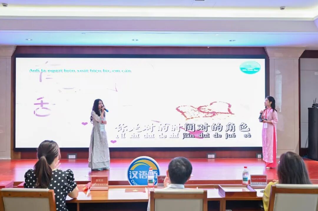 紧接着,越南外贸大学的同学们用清澈的嗓音演绎了中国流行歌曲《有点甜》,熟悉的旋律瞬间点燃全场热情,中国学生情不自禁地跟着哼唱起来。当《Xin Chào Việt Nam》的旋律响起时,整个会场化作歌声的海洋,两国学子用音乐架起心灵的桥梁。这场跨越语言的“对话”,不仅展现了语言的独特魅力,更传递出年轻一代对彼此文化的真挚热爱与无限激情。