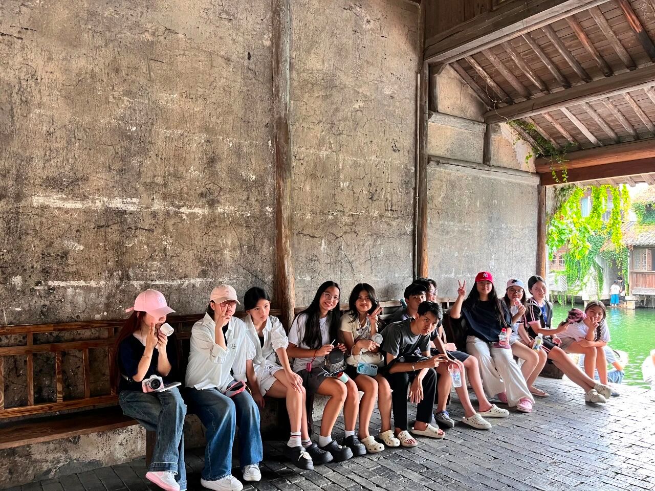 7月19日上午,营员们走进乌镇西栅景区。青石板巷间,枕水而居的明清建筑群吸引着他们,“快看这些雕花木窗!”越南学生Bùi Bảo Phương(裴宝芳)举起相机,将精妙的牛腿梁枋收入镜头。大家沿河道穿行,沉浸在江南水乡唯美意境中,手机相册里的无数古建特写,拼凑成东方营造美学的数字拼图,同时也感受着这座 “国际互联网小镇”的现代活力。