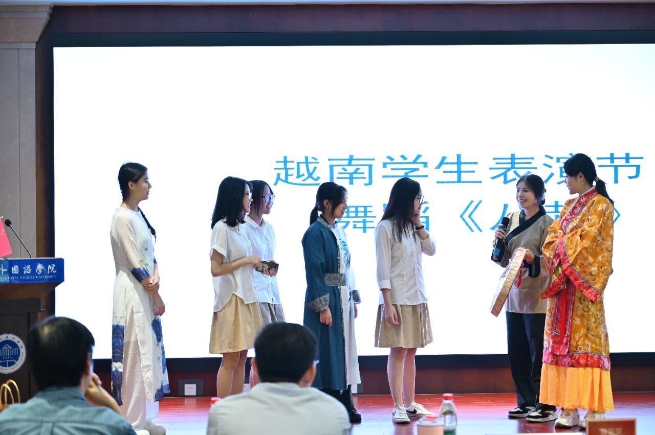 结营仪式后的中越学生联欢活动中,我校越南语专业学生代表带来情景剧《越南粽子糍粑之起源》,越南河内中学生夏令营营员表演了舞蹈《Bắc Bình》《卜卦》,全体营员还合唱了歌曲《You Raise Me Up》。两国青少年的笑脸在舞台上下交相辉映,现场洋溢着跨越语言的欢腾与暖意。