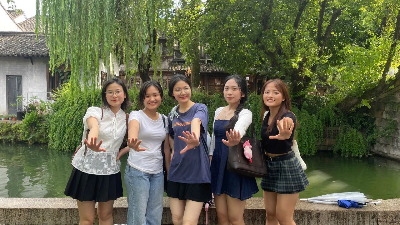7月29日下午,细雨中的乌镇更显韵味。Nguyen Ngoc Linh(阮玉玲)轻抚斑驳老墙:“雨中的白墙黛瓦,像极了水墨画。” 茅盾纪念馆里,Do Minh Thu(杜明秋)对着民国打字机出神:“原来大作家用这样的机器创作!”染坊内,Tong Khanh Linh(童庆玲)发现越南传统奥黛与蓝印花布纹样相似,惊喜欢呼:“我们的文化早就相遇过!”雨势渐大,师生们躲进茶馆,热茶氤氲中,乌镇的温柔与友谊的温暖融为一体。