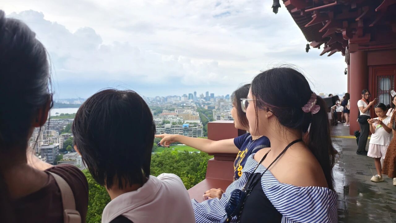 7月25日傍晚,城隍阁上,越南学生惊叹于建筑的精巧斗拱。登顶俯瞰,杭州城万家灯火尽收眼底,Khuong Minh Ngoc(姜明玉)举着手机拍摄:“这个视角太神奇了,像把杭州的历史与现代都装进了相框。”