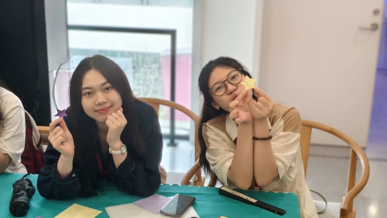 上城区非遗展示中心内,营员们跟着跟着钱海琴老师和我校校友王浩峰学剪纸。Nguyen Huyen Trang(阮玄庄)小心翼翼裁剪红纸,展开后看到红灯笼图案时,眼睛笑成月牙:“一张纸能变出这么美的东西,中国手艺像魔法!我要带回去给家人看看。” 红纸在指尖舞动,化作传递文化温度的符号。