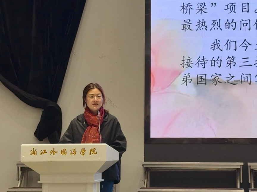 对沙特师生表示热烈欢迎。她指出,本次冬令营代表团是该校“汉语桥”项目迎来的第三批沙特学子,这充分彰显了中沙两国高等院校在教育合作中结下的深厚情谊。曹笑笑强调,杭州与阿拉伯世界有着悠久的交往渊源,著名阿拉伯旅行家伊本・白图泰的游记记载,以及西湖边留存的早期穆斯林学者陵墓,都是双方历史上密切交流的珍贵见证。如今,沙特同学们怀揣着汉语学习的热忱与对中国文化的浓厚兴趣来到杭州,既是对两国深厚历史交往遗产的传承,也将在新时期扮演起中沙文化使者的重要角色。她衷心希望沙特同学们能在冬令营期间,亲身感受真实、多元、进步的中国,将所见所闻带回沙特,成为搭建中沙青年友谊的坚实桥梁。