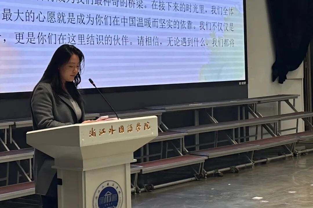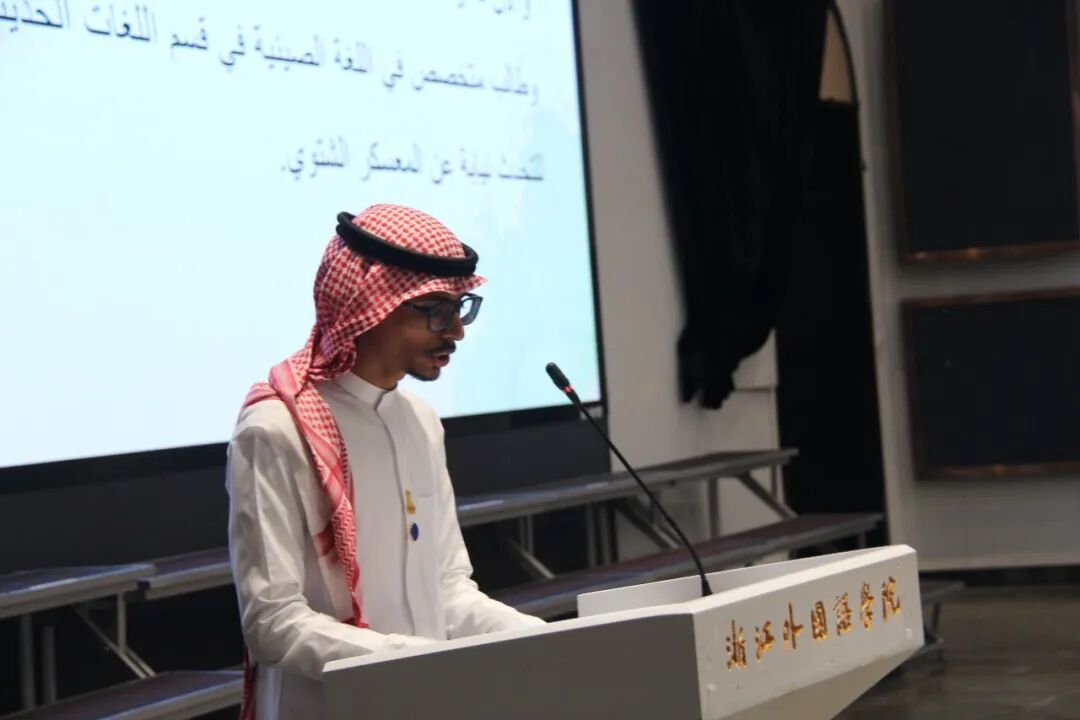 在学生代表发言环节,来自阿卜杜勒・阿齐兹国王大学中文专业的李明宇同学,尽管仅学习中文三个月,仍用较为标准的中文分享了自己在沙特学习汉语的经历,以及初到杭州的新鲜感受与喜悦之情。他表示,希望通过此次冬令营及未来的交流,结识更多中国朋友,也热烈欢迎中国朋友前往沙特做客。浙外阿语专业学生郭文基作为志愿者代表发言,她表示在接下来的活动中,志愿者们不仅将做好项目协助工作,更会成为营员在中国学习与生活中值得信赖的伙伴。郭文基提到,语言是连接彼此心灵的神奇桥梁,愿中沙学生在接下来的交流中收获知识与友谊,共同缔造一段值得永久珍藏的青春回忆。