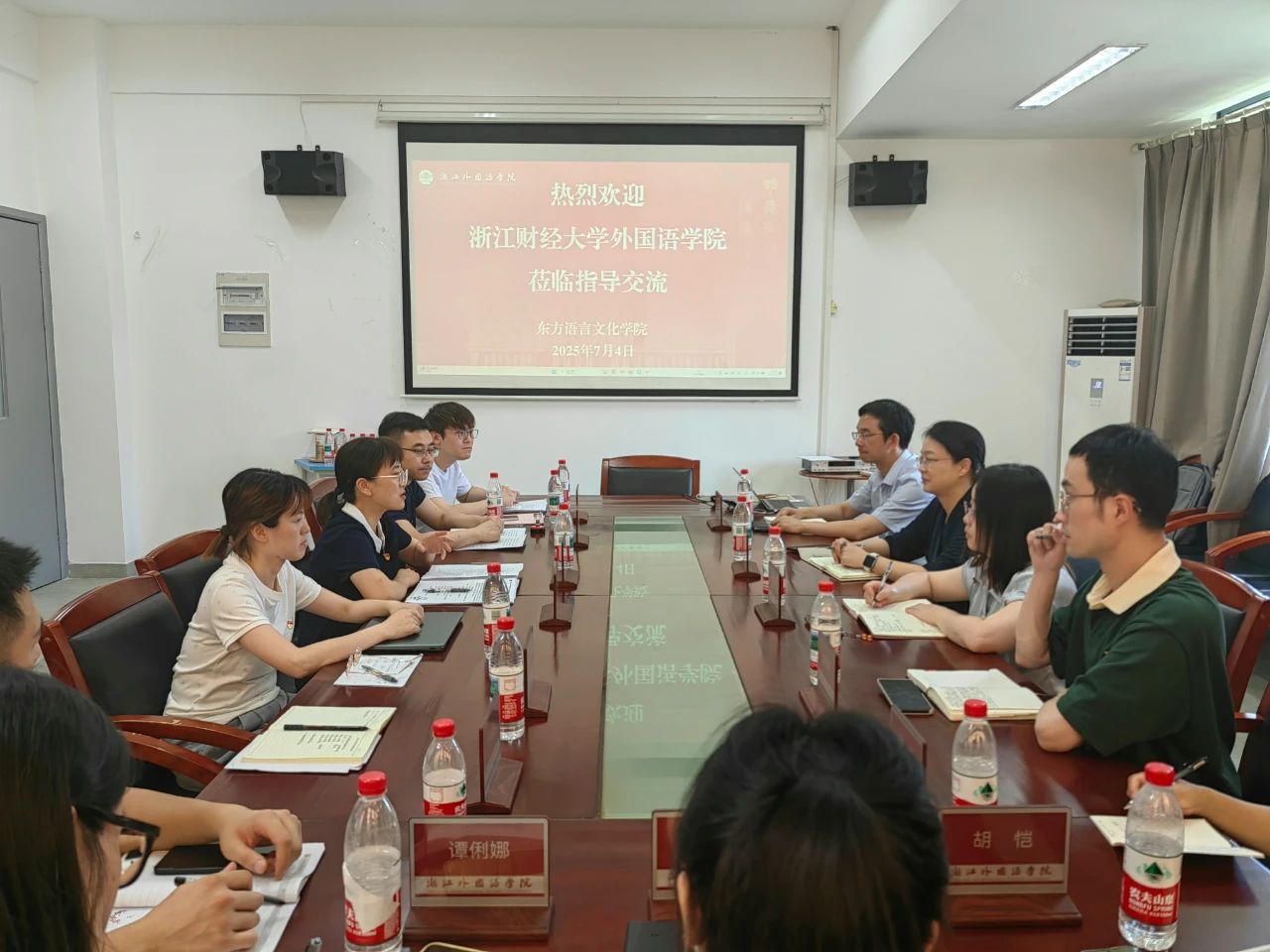 党委书记夏颐、党委副书记宋洋、副院长马一川、学术副院长孙霁,以及辅导员蔡胜、苏宣丞;浙江财经大学外国语学院党委副书记张莲、副院长熊建国、学术副院长胡图南、大学外语部副主任张迅、组织员胡恺,以及辅导员谭俐娜、郭春娟等参加交流。