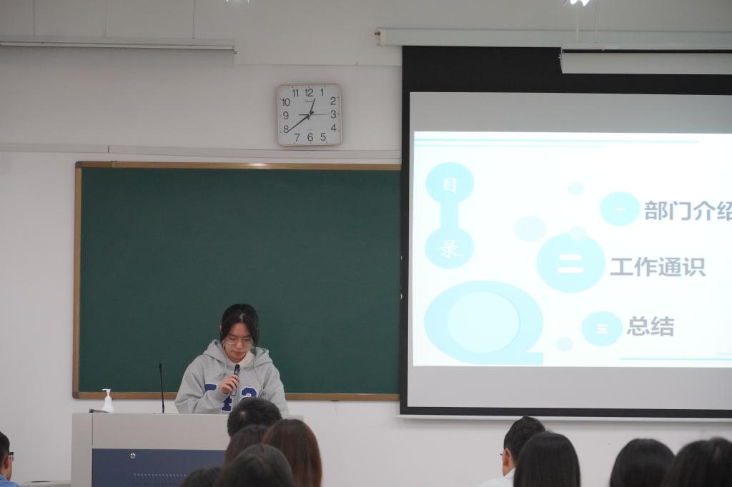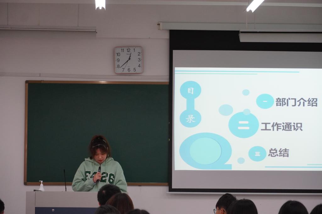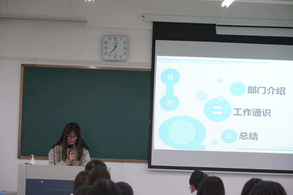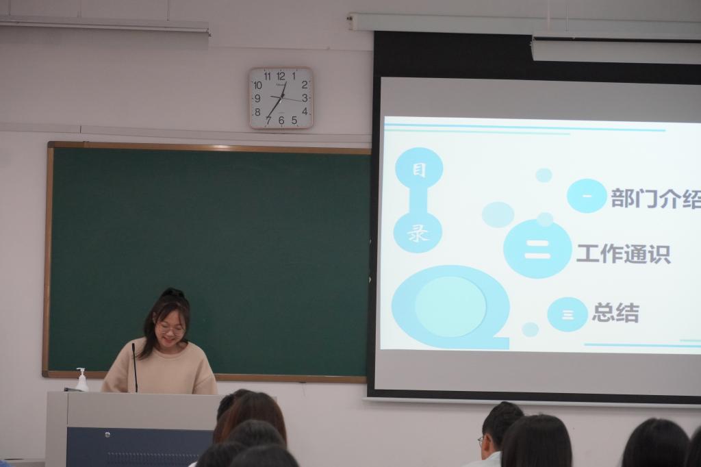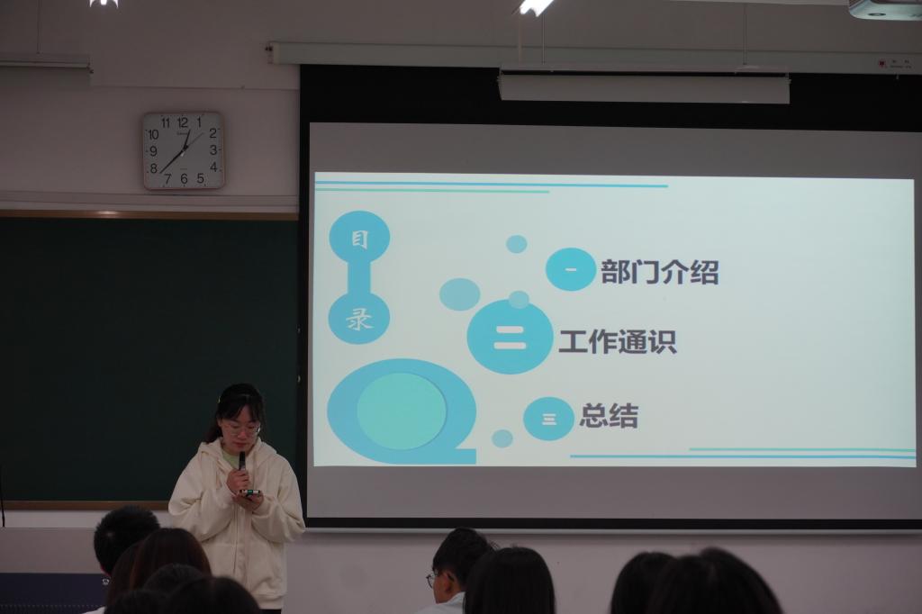 夏雪莉和李科毅分别介绍了团委与学生会的基本职能。随后,团委志工部、就创部、心服部、素拓部、组织部、办公室及学生会权益部、学习部、文体部、秘书处等各部门负责人先后上台发言,向新成员们介绍各部门的具体工作内容,激发了学生们的热情和信心。