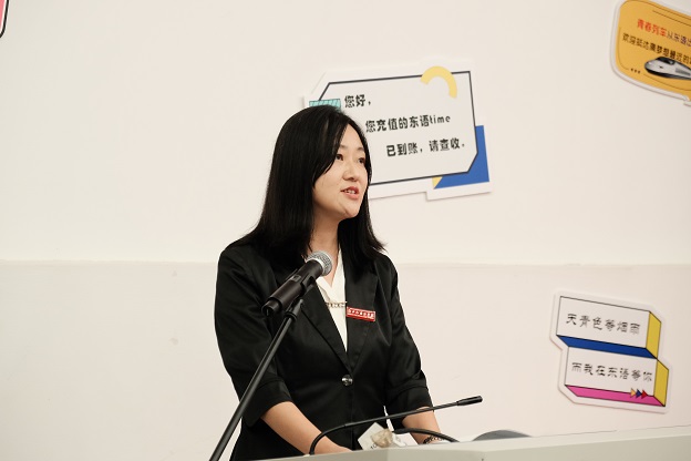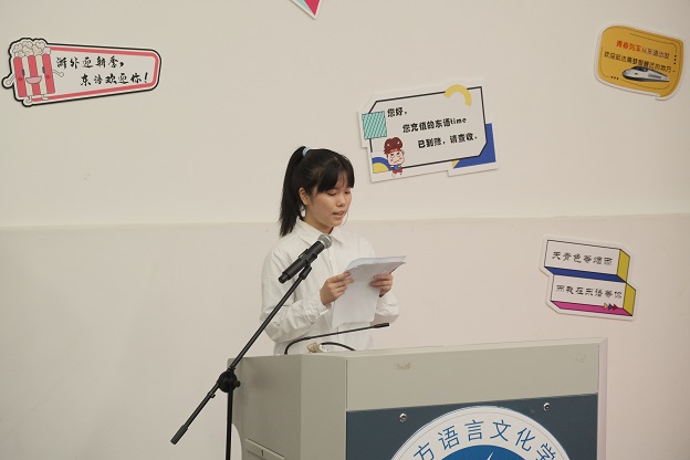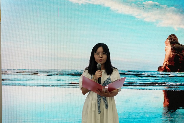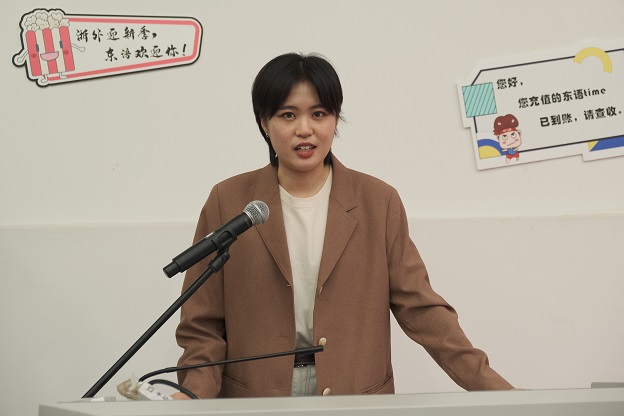 18级朝鲜语1班的何君颐,作为老生代表上台发言。她分享了自己的成长经历和大学的收获,希望每位同学都能把握提升自己的机会,在学习和工作、活动中找到平衡,规划精彩的大学生活。