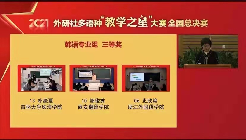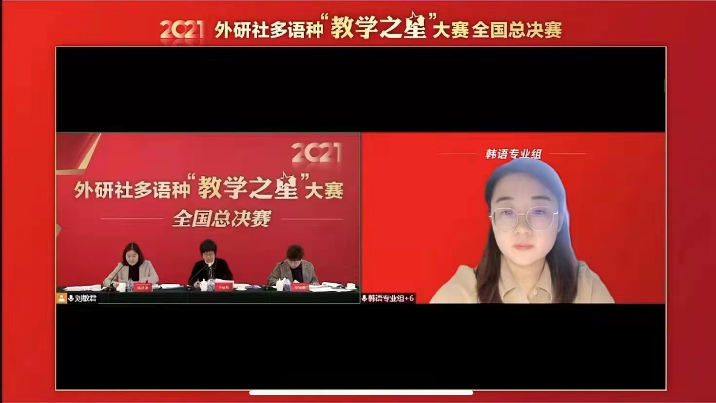 本次全国总决赛受疫情影响,首次采用线下评审与线上比赛相结合的形式进行,并通过微信公众号直播。比赛环节分为说课、教学展示及专家提问三个环节。比赛奖项设置为全国一等奖一名,二等奖二名,三等奖三名。在全国总决赛阶段,史欣艳老师以基础韩国语课程为定位,围绕《新国标》对于外语类人才的培养要求,通过对课程目标及学情的精准分析,进行了设计完整、思路清晰的现场说课及教学展示,凭借先进教学理念、扎实的教学基本功、自信大方的姿态,赢得了专家评委的认可,最终从众多选手中脱颖而出,取得了大赛韩语专业组三等奖的好成绩。好成绩的取得离不开学校教发中心与学院的支持以及系里教师间的磨课与指导。