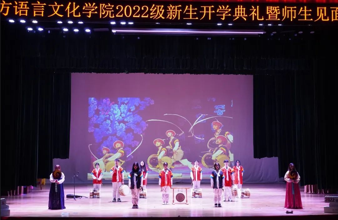 师生见面会环节,学院各系的老师们身着语言对象国的传统服饰依序登台,向新生们作介绍。他们各具特色、生趣活泼的介绍,拉近了与新生们的距离,也使同学们对所学专业有了初步的认识。老师们精神饱满,神采奕奕,给新生们送上了真挚地祝福与鼓励。辅导员老师们也登上舞台,向新生们送上美好的祝愿与期许。