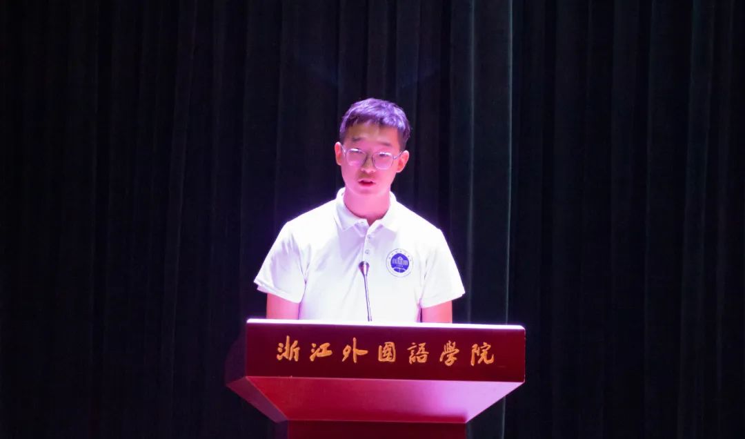 22级日语3班韦毓霖代表新生发言。他表达了对大学生活的憧憬与向往,发出了要牢记和践行校训精神,志存高远、奋发有为,在小和山下书写不负韶华、不负时代、不负人民的青春篇章的青春誓言。
