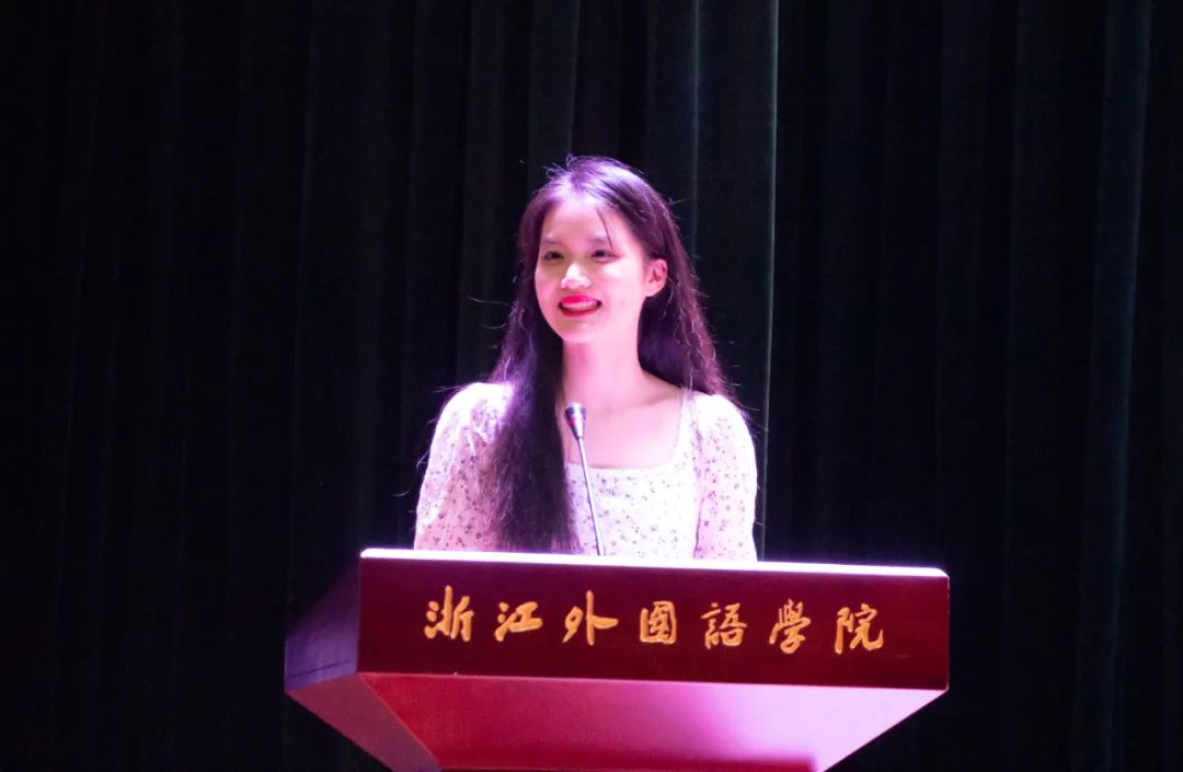 20级阿拉伯语1班王籽玲作为老生代表发言。她为初入校园的新生如何调整心态适应大学生活提供了建议,并代表全体老生表达了愿意伸出热情的双手,给予新生们鼓励和帮助,为他们祝福的共同心声。