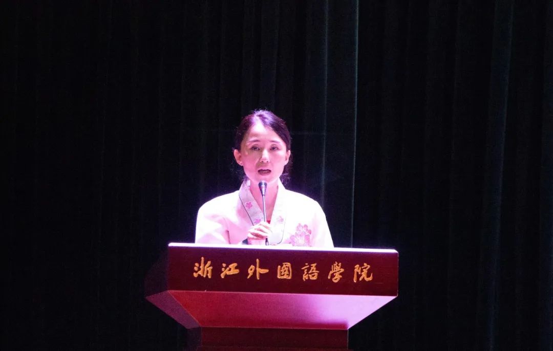 朝鲜语系系主任李花子老师代表新生班主任发言。她谈道:“韩语有句俗语叫做‘티끌 모아 태산’——‘积土成山,风雨兴焉;积水成渊,蛟龙生焉。’ 相信只要同学们按部就班、坚持不懈地学下来,‘守得云开见日出’,必将学有所成。”