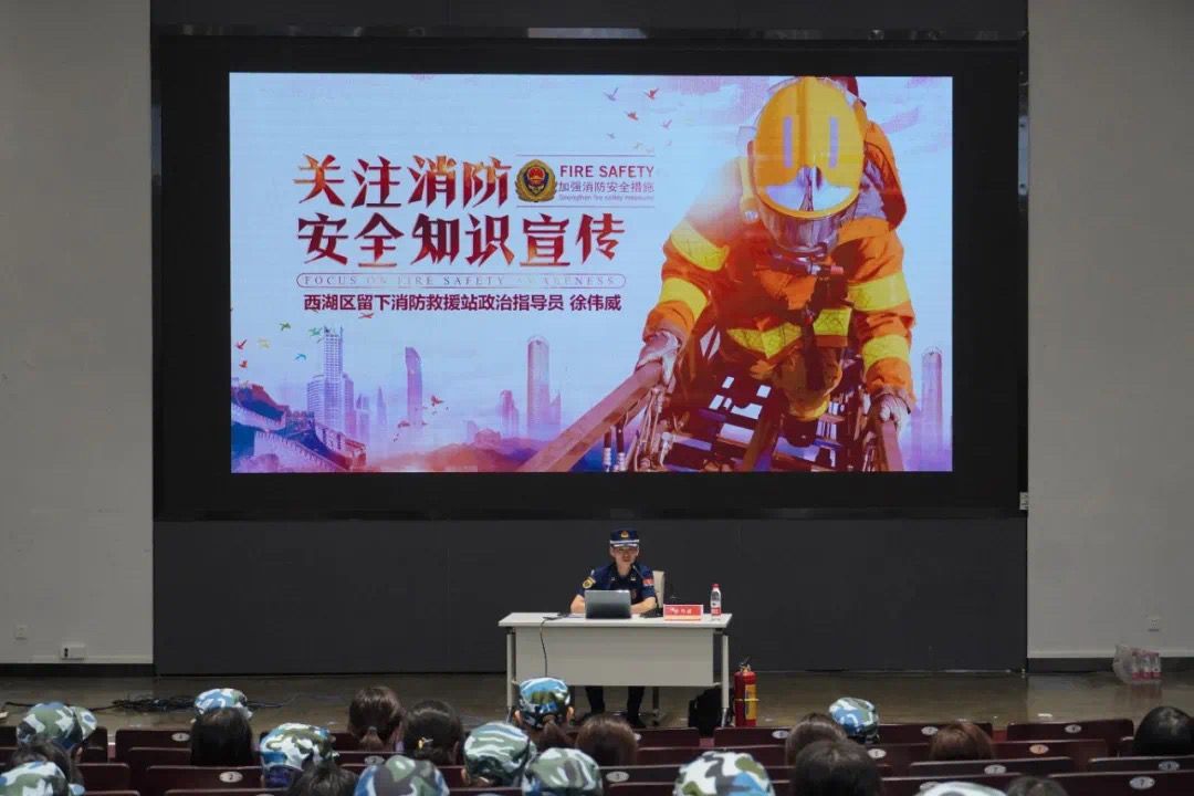 军训不仅有军事技能的学习,也有团队协作和自我防护意识的培养。9月23日,在留下街道消防救援站指导员的带领下,同学们学习消防知识并开展消防演练。