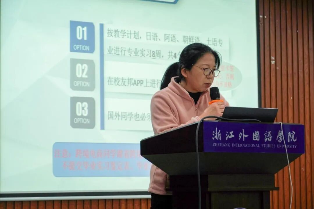 学院教务秘书郭翠红详细讲解了实习注意事项与具体要求。她勉励同学们要充分发挥主观能动性,内强素质,外树形象,自觉展现浙外学子的优秀风采,以高度的责任感圆满完成毕业实习。