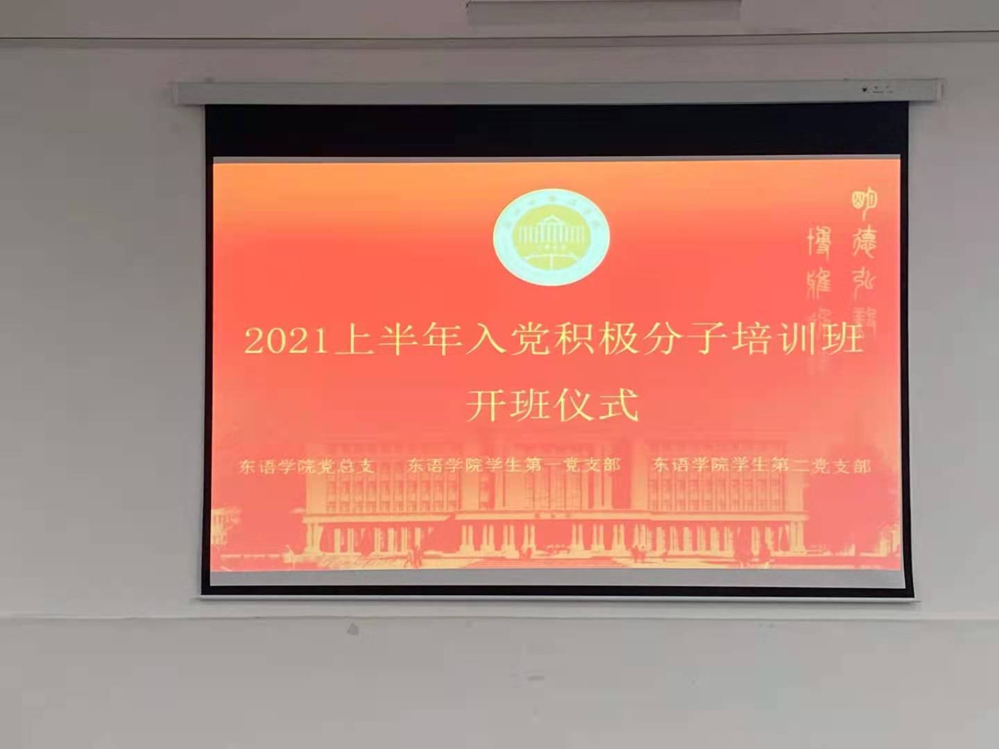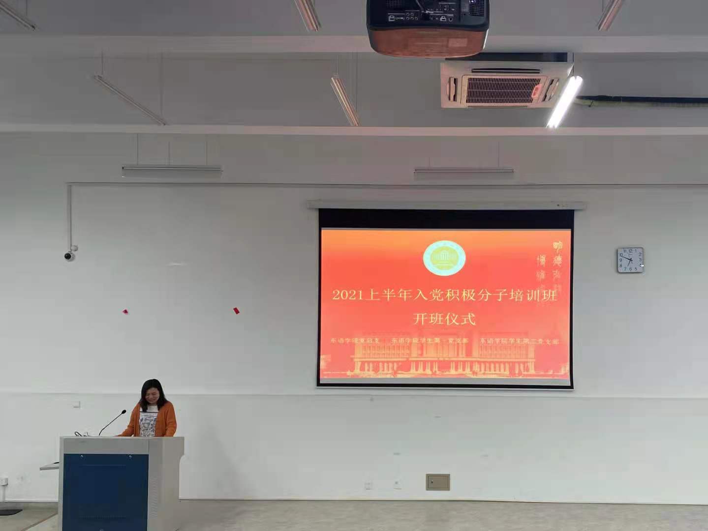 2021上半年入党积极分子培训班开班仪式于融D108顺利举行。党总支副书记方盼老师出席并讲党课,学生第一党支部书记杜茜老师主持开班仪式。