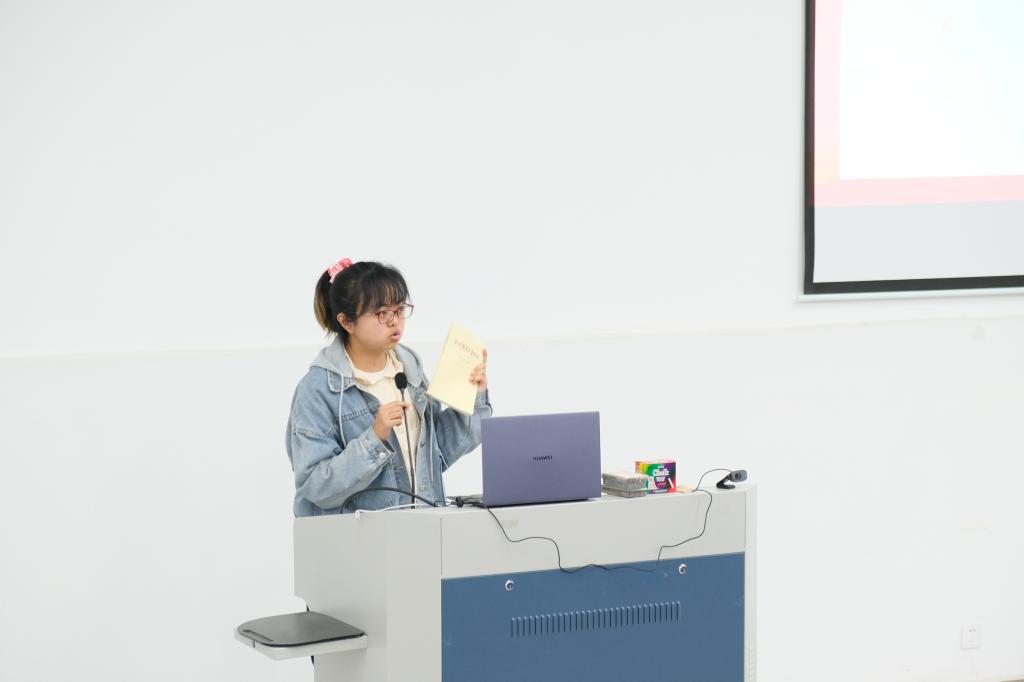 高兴跟大家分享了她在书中最有感触的一篇——《崇尚英雄、学习英雄、关爱英雄》,她认为身为大学生的我们,应该认真思考,重新定义英雄与偶像,也就是应该粉对人,把爱岗敬业,爱国忠党,服务大众的普通人作为我们的英雄、作为榜样,勉励自己向优秀的人靠拢。最后她希望大家保持初心,继续努力,一步步靠近梦想,靠近榜样,做这时代的小英雄。