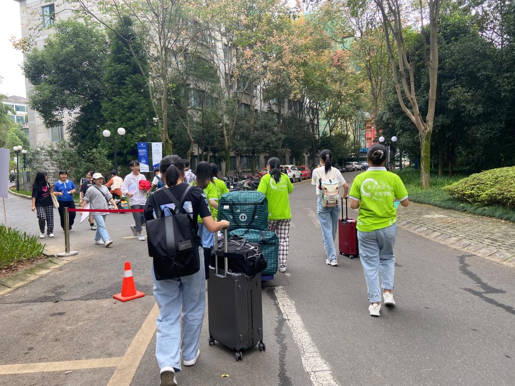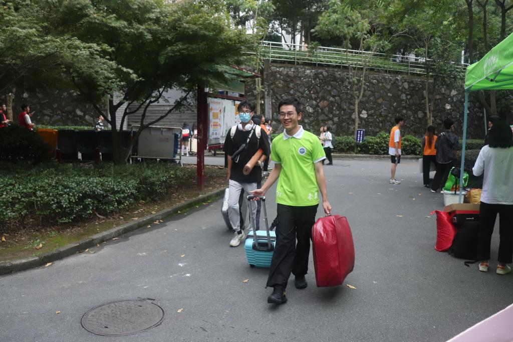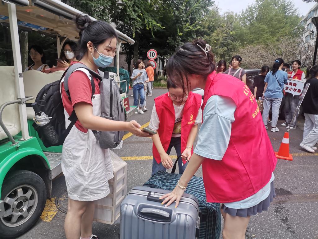 迎新情况,并向现场的志愿者们送去关怀和慰问。洪校长亲切地对班助们说道:“去年是你们的学长学姐迎接你们,今年你们以学长学姐的身份迎接新生,要把友爱接力传承下去,帮助新生顺利入校报到。”