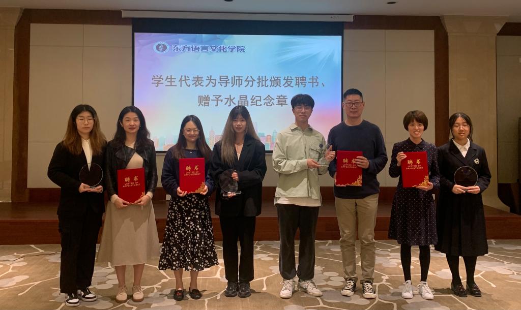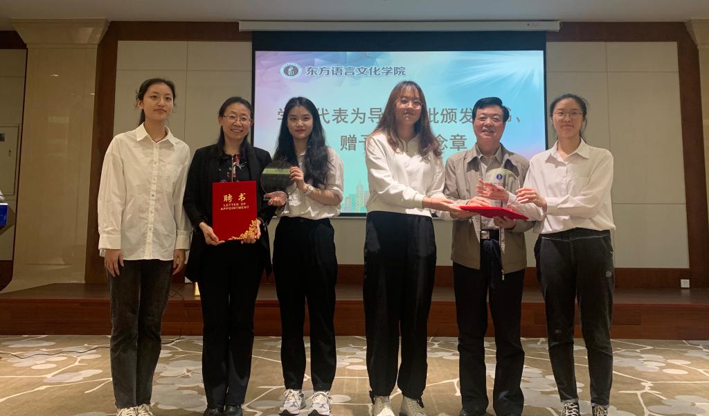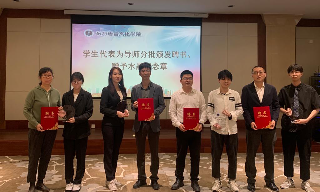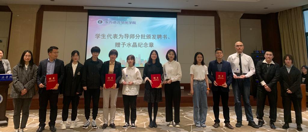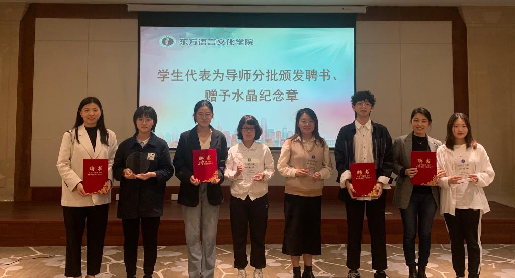 现场,学生代表为全体导师献上聘书、水晶纪念牌。